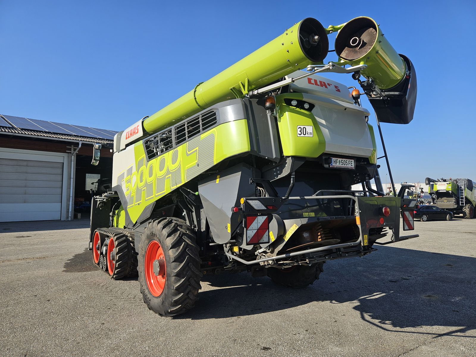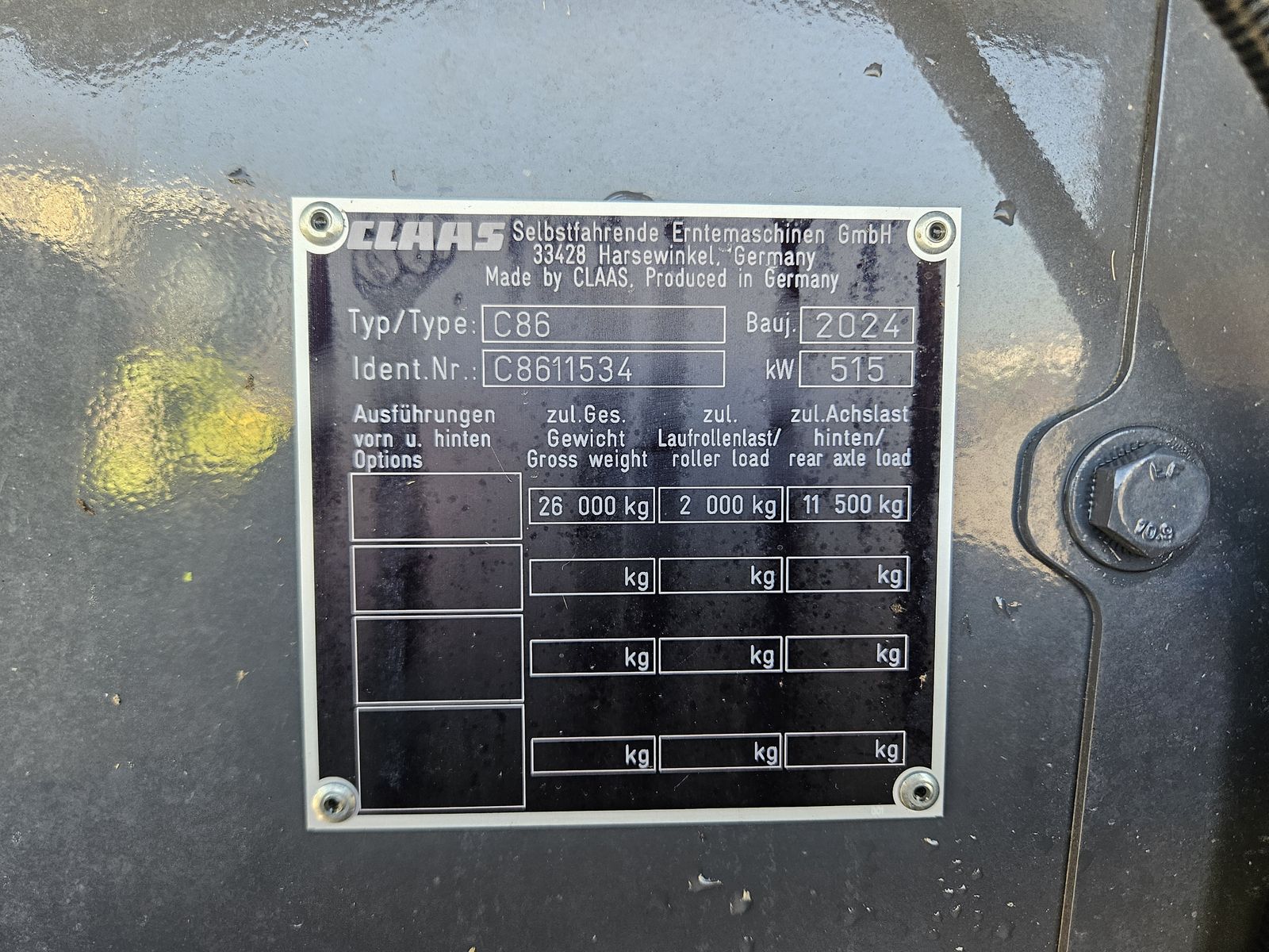 Ersteinsatz 2025, Vorsatzgerätantrieb M konstant, Schneidwerkzylinder mit 2-Wege-System L, HP-Kanal AUTO CONTOUR Kette Umlenkwalze offen, Anhängekupplung automatisch, Staubabsaugung für E-/V-/HP-Kanal, CRUISE PILOT vorbereitet, Schneidwerkbremse, APS Dreschsystem - Getreide (10/7/18), Dreschtrommelantrieb 330-930 U/min, Dreschkorbleiste, ROTO PLUS Standard 4/6, JET STREAM Reinigung inkl. 3D, GRAINMETER inkl. Überkehr Volumenmessung mit CEBIS Anzeige, Ober- und Untersieb Standard, Korntank 15.000 Liter, Korntankauslaufrohr 4XL Ø 420 mm klappbar, Korntankentleerung 180 l/s, Antrieb Korntankentleerung 150 l/s - 180 l/s, Auslauftülle schwenkbar - Korntankauslaufr. 4XL klapp. Ø420 mm, Radialverteiler Getreide - SPECIAL CUT, Zusatzpumpe Antrieb Strohverteiler mit Spreuwurfgebläse, Strohhäckslerantrieb für Radialverteiler Premium Plus, Triebachse XL - TERRA TRAC, TERRA TRAC Laufbandbreite 635 mm Camso, Aufstiegsleiter mit Anfahrsicherung - TERRA TRAC, POWER TRAC Lenktriebachse XL einstellbar, Lenkachsbereifung 500/85 R34 x 335 IMP 10-Loch Mitas, Fahrgeschwindigkeit 40 km/h, Plattform TERRA TRAC L1, MAN D4276 - 515 kW/700 PS (Stage V) mit Luftkompressor, Kraftstofftank 1.150 Liter, Klimaautomatik mit Heizung, Radio Soundsystem, Ablagefächer mit USB-C-Anschluss in B-Säule, Sonnenrollos für Seitenscheiben, Fußrasten an Lenksäule rechts/links, Kamera - Heck + Anhängekupplung + Korntankauslaufrohr, PROFI CAM, CEMIS 1200 Terminal mit RTKnet, QUANTIMETER Ertragsmessung, CLAAS Remote Service inkl. Fünfjahreslizenz, Komfortsitz - Stoff luftgefedert, Arbeitsbeleuchtung LED - Premium, Korntankvorbereitung GPS PILOT, SAT 900 GNSS-Empfänger, Freischaltung GPS PILOT – SAT 900 GNSS-Empfänger, Staubox inkl. Einweisersitz -580,00, CEMOS AUTOMATIC - AUTO THRESHING, CEMOS AUTOMATIC - AUTO SEPARATION, CEMOS AUTOMATIC - AUTO CLEANING, CEMOS AUTOMATIC - CRUISE PILOT, GRAIN QUALITY CAMERA, CEMOS AUTOMATIC - 4D-Reinigung, Multifunktionsgriff C-motion, Neigungssensor, Lenkwinkelsensor, CLAAS Kommunikationsmodul (LTE), Schließsystem Standard, Umrissbeleuchtung inkl. Rückleuchten LED ausziehbar, Scheibenwischanlage für Frontscheibe, GPS PILOT Ready, Machine connect Lizenz – 5 Jahre, Wurfrichtungsanpassung automatisch, Dynamische Lenkung, Rückspiegel elektrisch einstellbar und beheizbar, Schlauchaufroller mit Luftkompressorschlauch und Druckluftpistole, Handwaschbehälter, Gesetzmäßige Ausrüstung für Rechtsverkehr, Rundumleuchten 4 Stück, Umrissbeleuchtung vorne und hinten, Warntafeln, Nahbereichsspiegel, Werkzeugsatz – Plus, Maschine ohne Schneidwerk