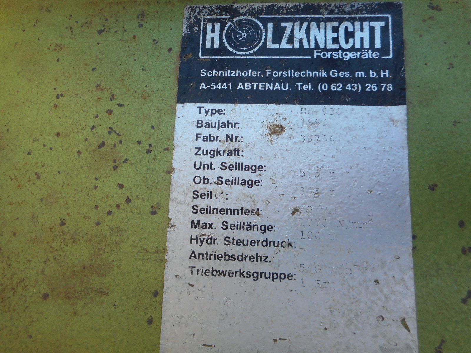 Holzknecht Forst Seilwinde HS 930 U, Baujahr 1990, Schildbreite 1,3m, mechanische Bedienung, 2 Seilgleiter mit Seilendstück inkl. Gelenkwelle, 4,5t Zugkraft,..